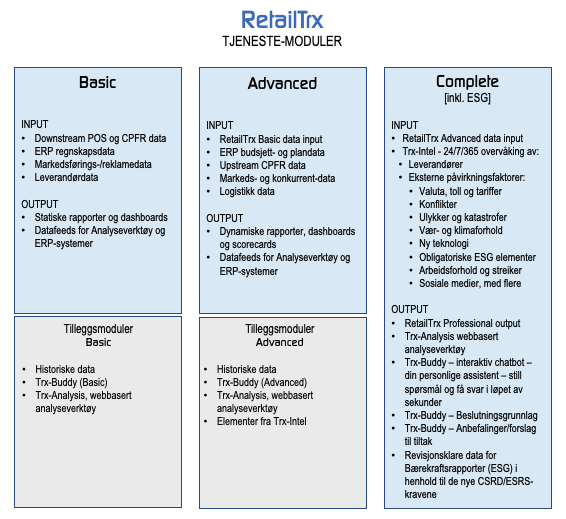 bygger videre på Basic ved å inkludere budsjett- og plandata, upstream CPFR, markeds- og konkurrentinformasjon samt logistikkdata. Dette gir dynamiske rapporter, dashboards og scorecards som støtter mer avansert styring av kategori, kunde og verdikjede, kombinert med datafeeds til eksisterende analyse- og ERP-løsninger.